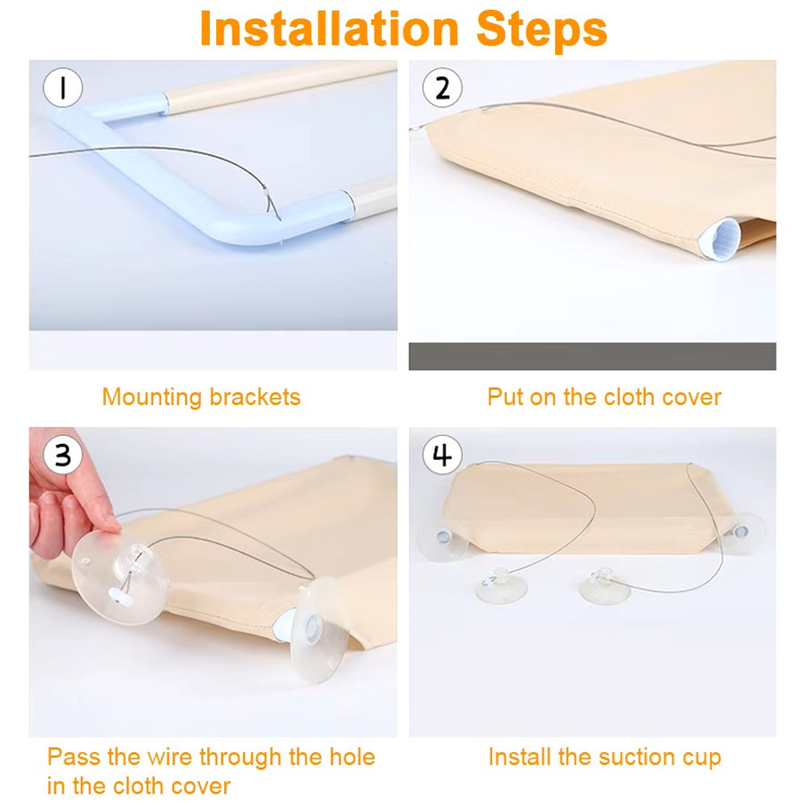First, attach the mounting brackets securely to the frame. Then, place the cloth cover over the brackets. Next, thread the wire through the hole in the cloth cover to ensure a snug fit. Finally, install the suction cups to your window, ensuring they are firmly pressed against the surface.