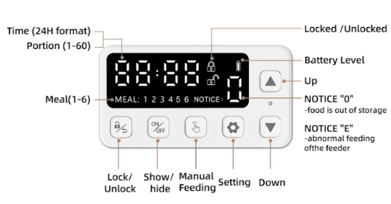 Easily set up and manage feeding schedules with intuitive button controls for hassle-free programming of meal times and portions.
