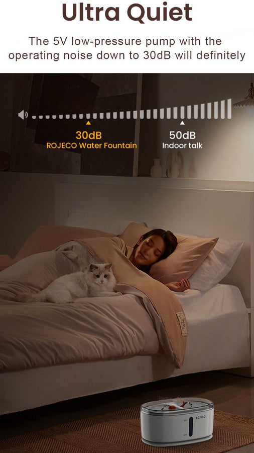 The ultra-silent pump operates at less than 30 dB, ensuring a quiet and comfortable drinking for your cat.