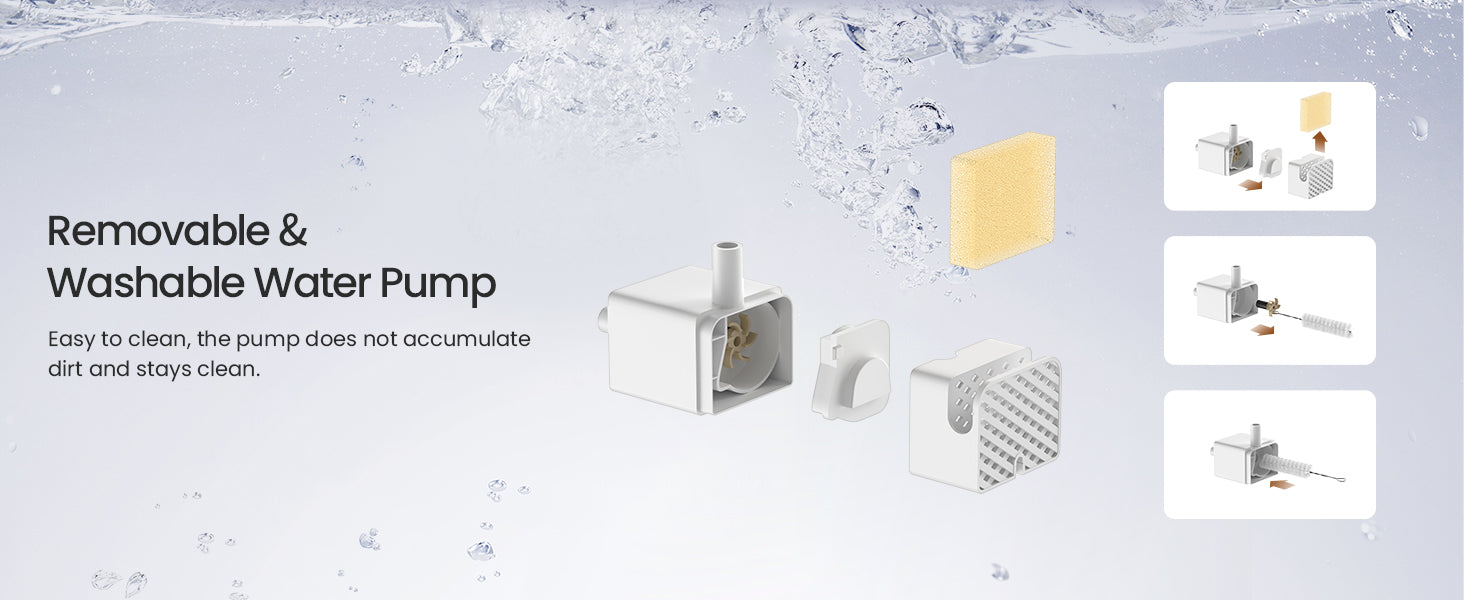 The CATSHEE™ pet water fountain features a wireless pump that eliminates the hassle of tangled cords, making cleaning every corner of the fountain a breeze.