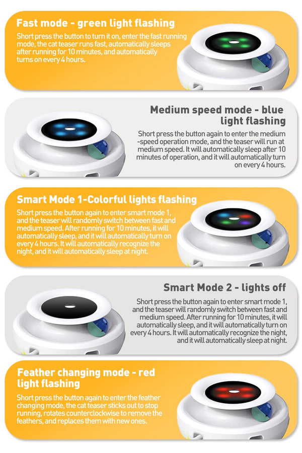 In Fast and Medium Speed modes, the toy automatically turns off after 10 minutes of operation and then turns on by itself every 4 hours. This allows you to spend the day out of the house without interruption, knowing that your cat is having a great time.